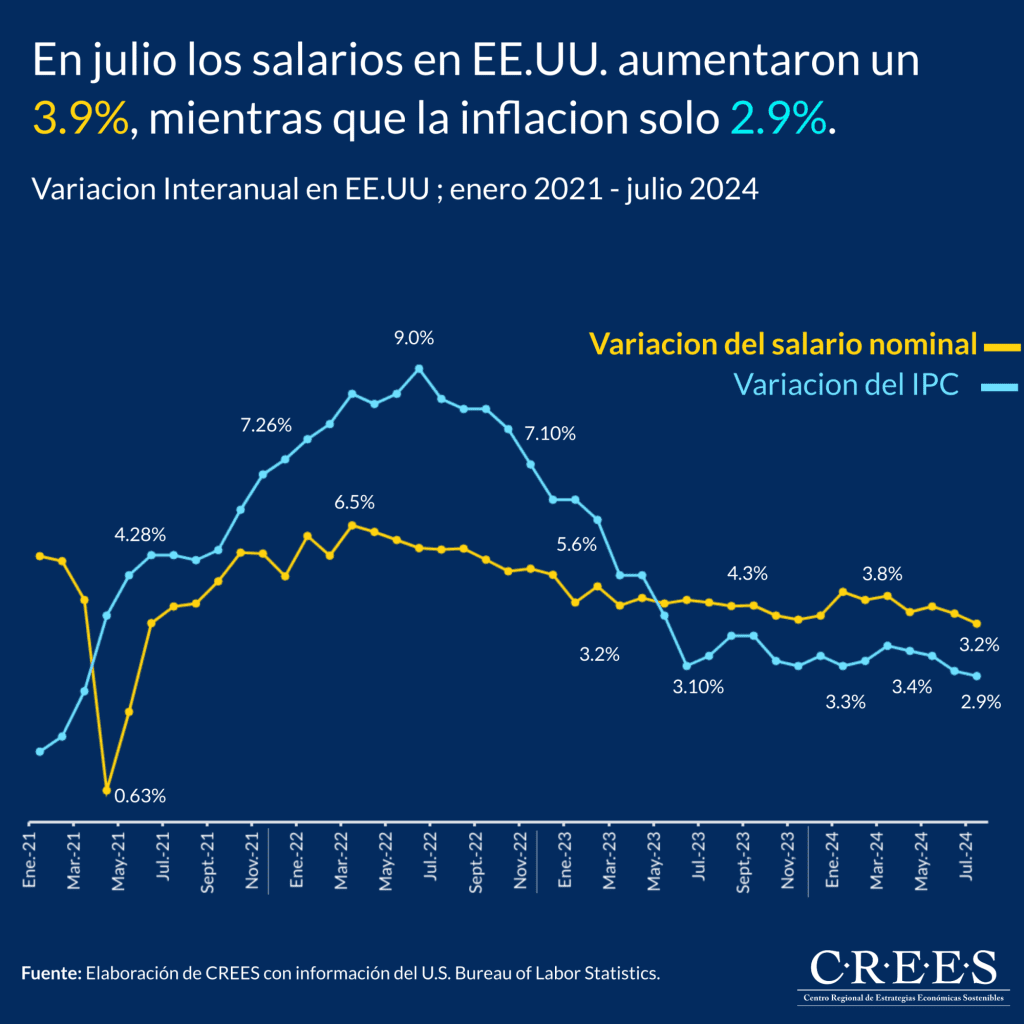 En julio de 2024, los salarios nominales en Estados Unidos aumentaron un 3.9% en comparación con el mismo mes del año anterior, mientras que la inflación de precios fue 2.9%. Aunque, en promedio, los salarios están creciendo más rápido que el promedio de los precios, este aumento es menor al que se observaba en 2022, cuando los salarios subían a un ritmo mucho más acelerado.