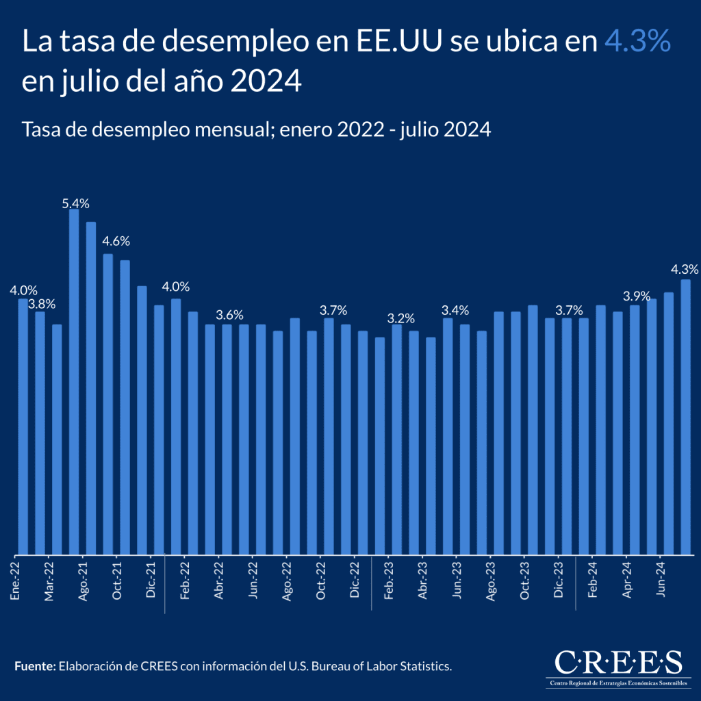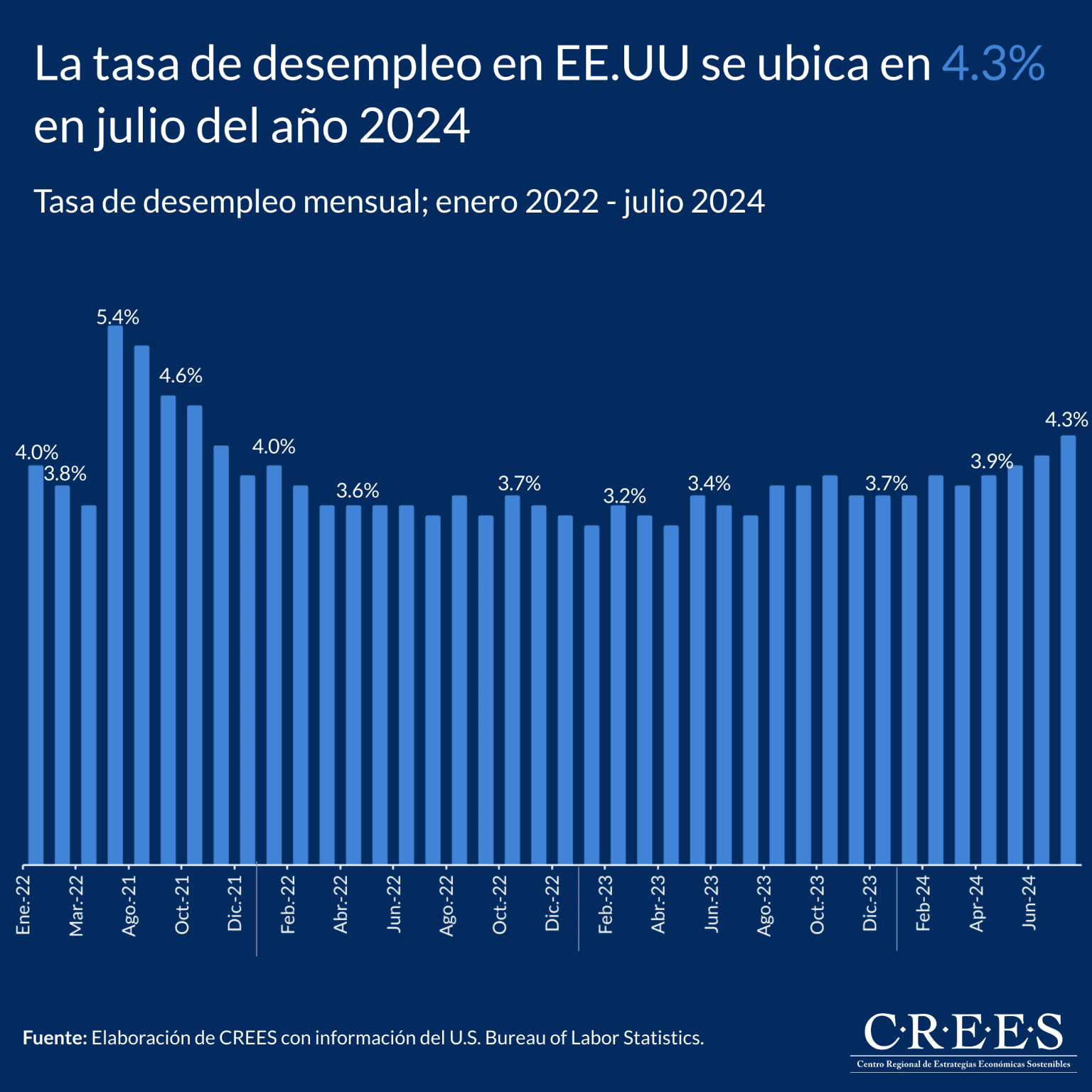Por otro lado, la tasa de desempleo alcanzó el 4.3% en julio de 2024, lo que representa un aumento en comparación con meses anteriores. En los últimos dos años, el desempleo ha tenido altibajos: en marzo de 2022 llegó a un máximo de 5.4%, luego bajó a niveles cercanos al 3.2% en 2023, sin embargo, desde abril se ha mantenido en ascenso.